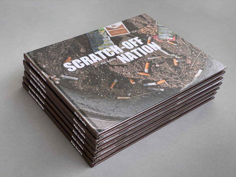 Scratch-Off Nation – Hardcover, Image Wrap, 70 pages, 47 four-color photographs. Copyright 2023 by Phil Scalia, printed by Conveyor Studio, edition of 125, 9″ X 11″.